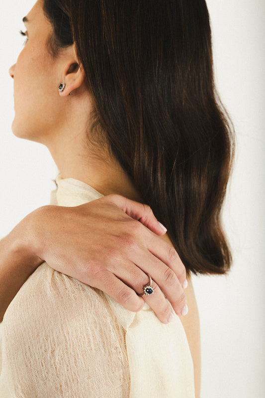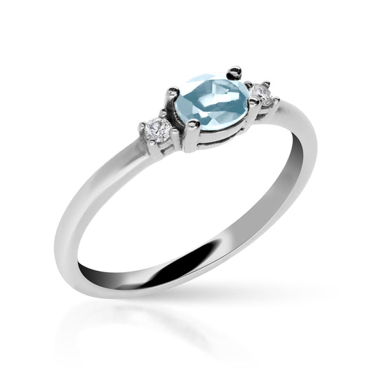 Anillo orla con piedra central de color y diamantes en oro de 18 K