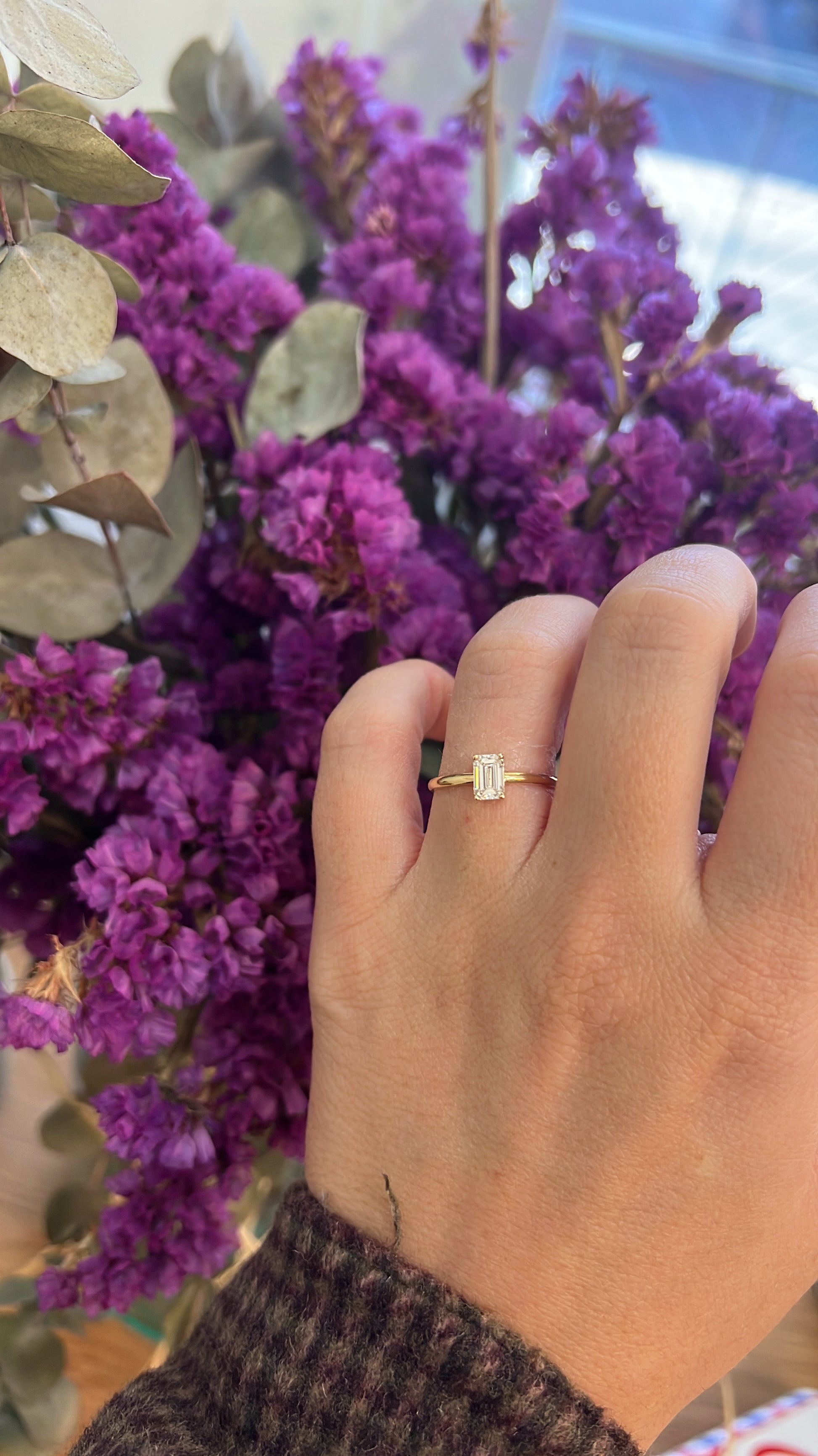 Anillo fabricado en oro de 9 Kts con diamante de laboratorio talla octogonal 6x4 mm con un total de 0,65 cts en color D y calidad VVS.